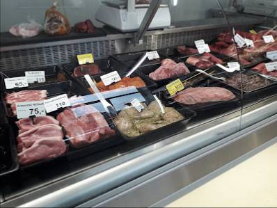 Liikkeellä on myynnissä erilaisia liha- ja tuotteita, kuten pöllö, raa'at liha- ja tuotteet, makkarat, leivontaa ja karamellia.